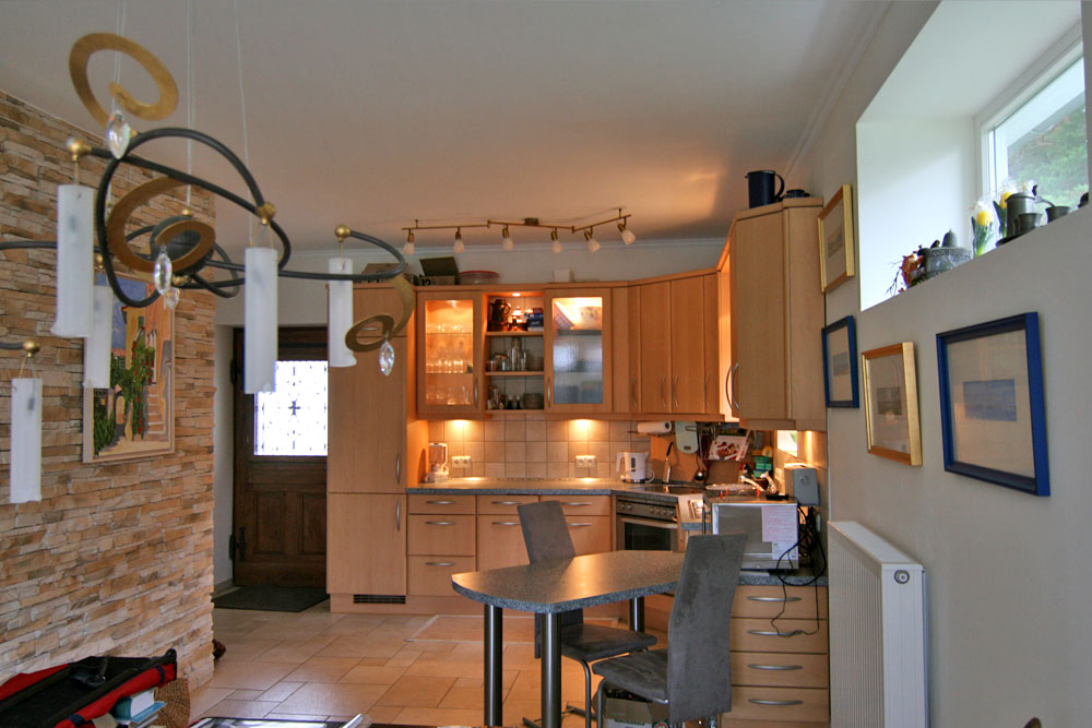 Die Küche ist für Kochprofis voll ausgestattet mit Spülmaschine, Cerankochfeld, Ofen, Mikrowelle, Kühl- und Eisschrank, sowie Kaffeemaschine, Mixer, elektrischer Brotmaschine und Koch-, Back- und Essgeschirr. Der Essbereich verfügt über ausreichende Sitzmöglichkeiten und geht in den Wohnbereich über.